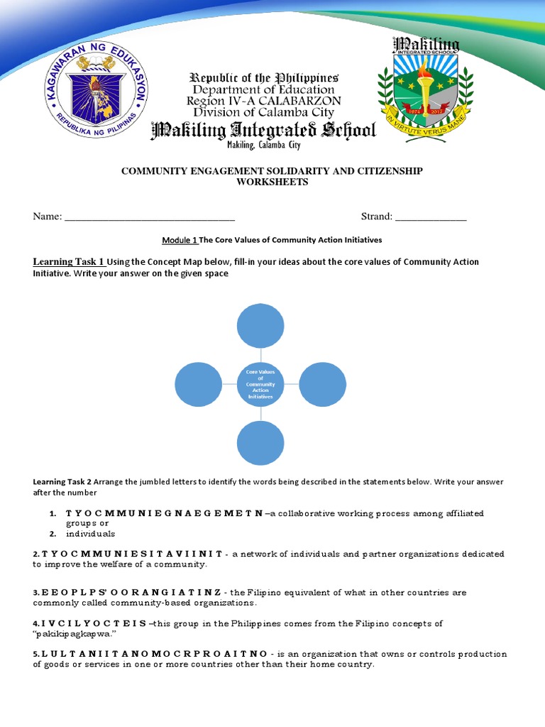 Learning Task 1 Using the Concept Map below, fill-in your ideas about the core values of Community Action