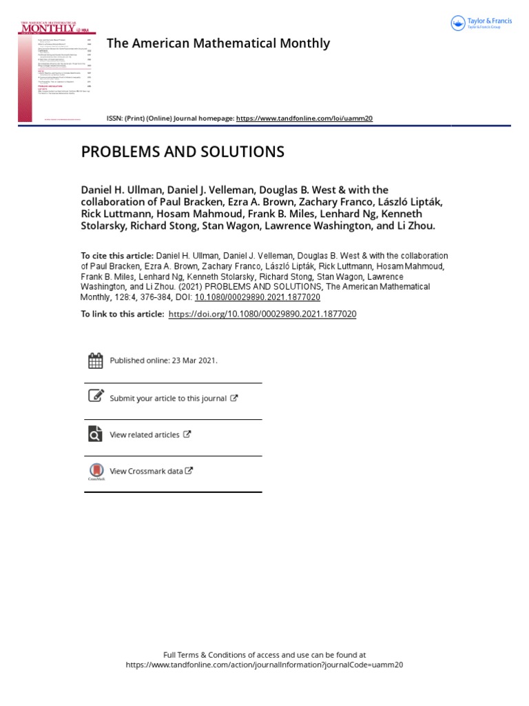 Washington, and Li Zhou. (2021) PROBLEMS AND SOLUTIONS, The American Mathematical