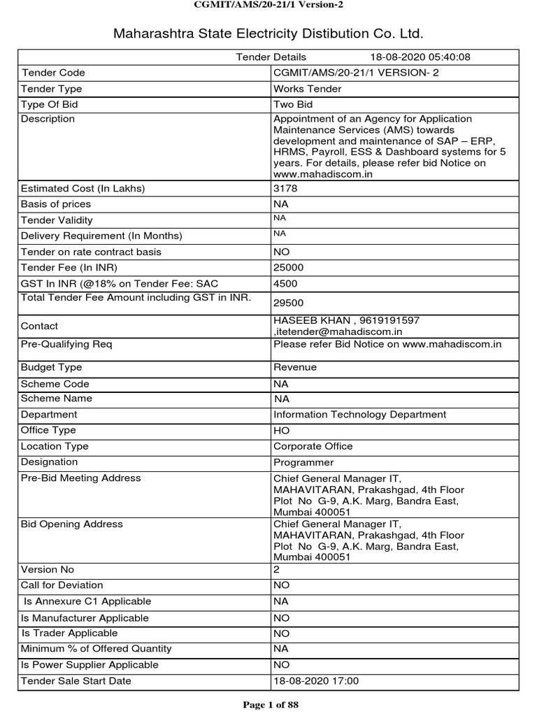 Maharashtra State Electricity Distribution Co. Ltd., payable at Mumbai as mentioned in details in Tender Document