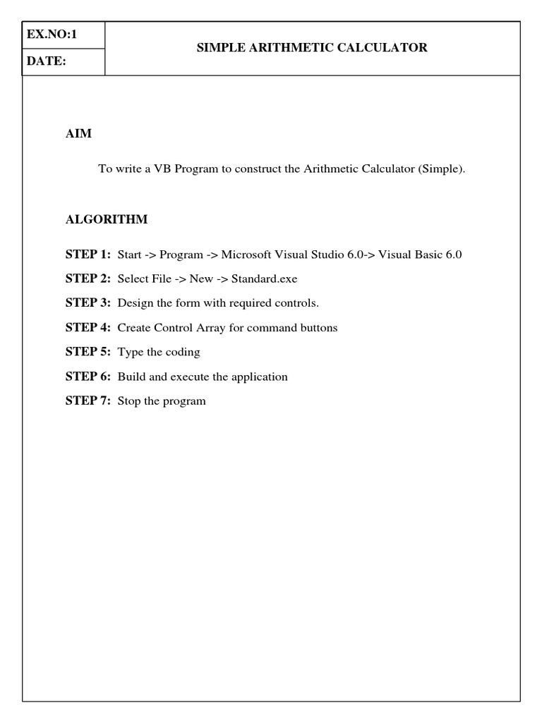 To write a VB Program to construct the Arithmetic Calculator (Simple).