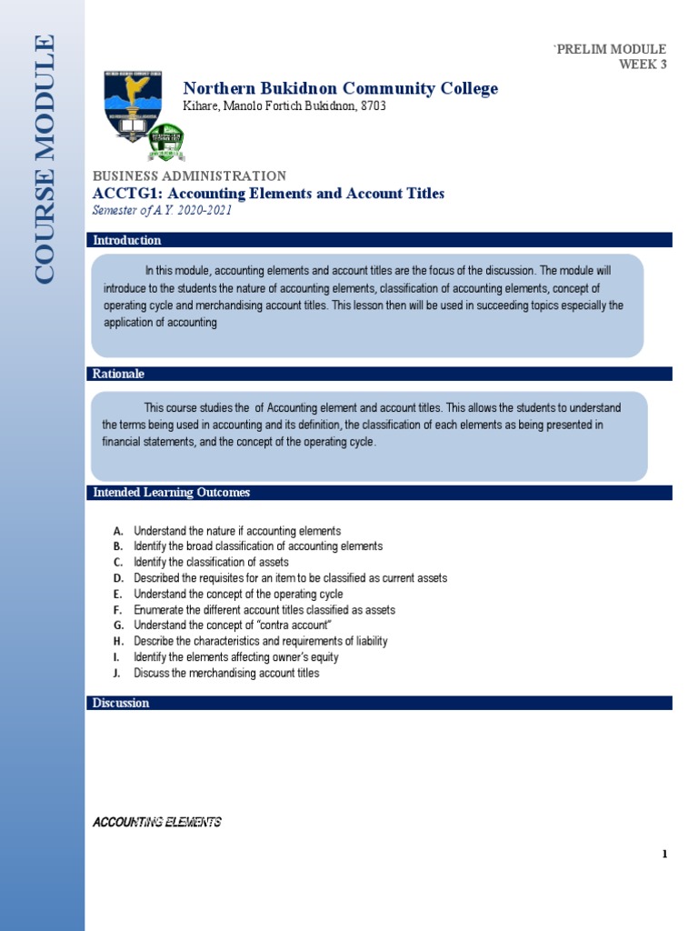 In this module, accounting elements and account titles are the focus of the discussion. The module will