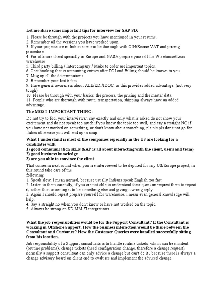 Let me share some important tips for interview for SAP SD: