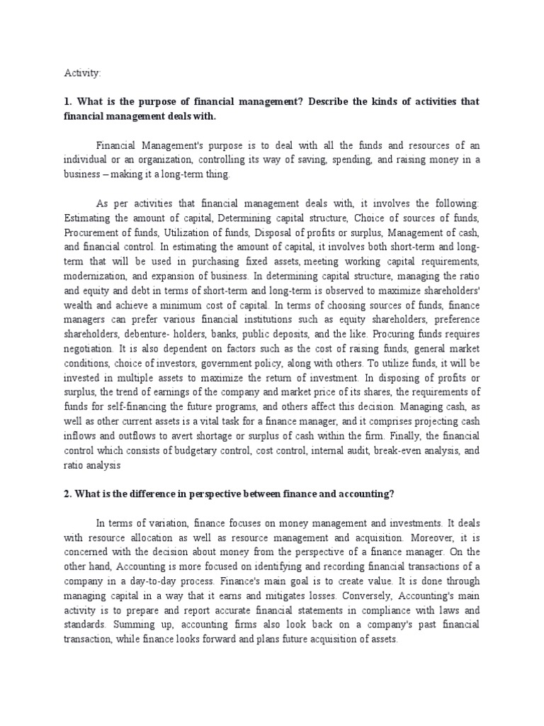 1. What is the purpose of financial management? Describe the kinds of activities that