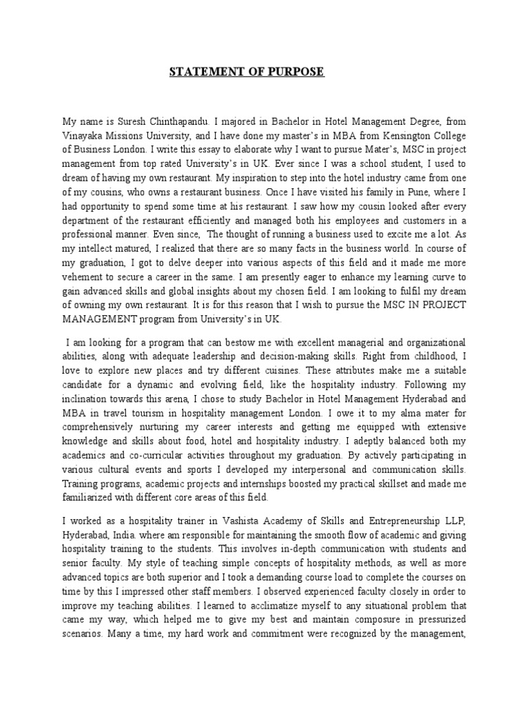 of owning my own restaurant. It is for this reason that I wish to pursue the MSC IN PROJECT
