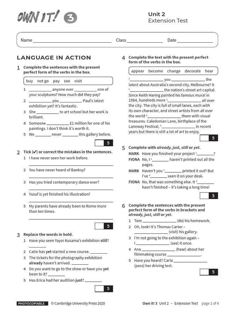 PHOTOCOPIABLE © Cambridge University Press 2020 Own it! 3 Unit 2 – Extension Test page 1 of 4