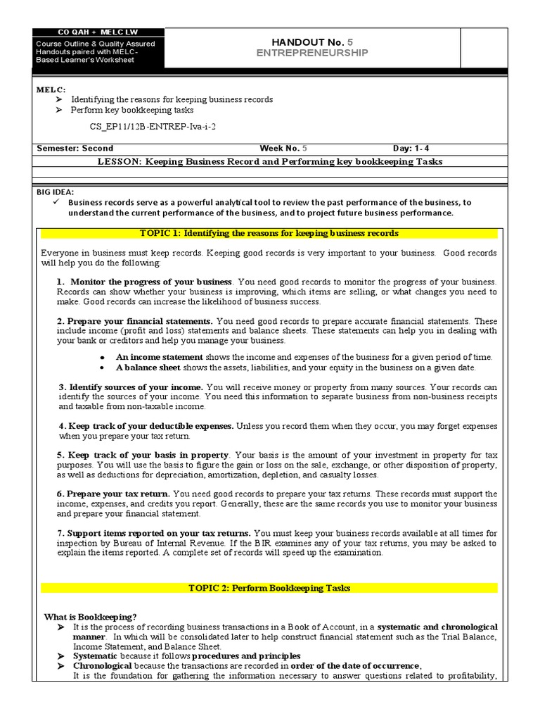 Handouts paired with MELC- ENTREPRENEURSHIP