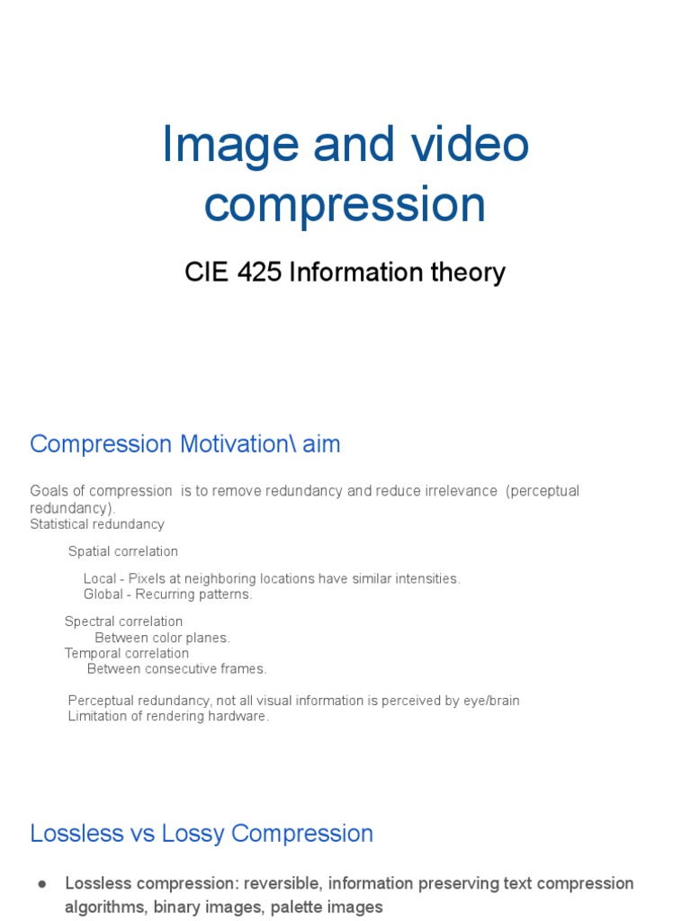 Goals of compression is to remove redundancy and reduce irrelevance (perceptual