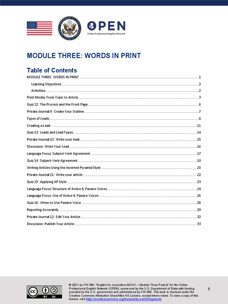 © 2021 by FHI 360. “English for Journalism MOOC – Module Three Packet” for the Online