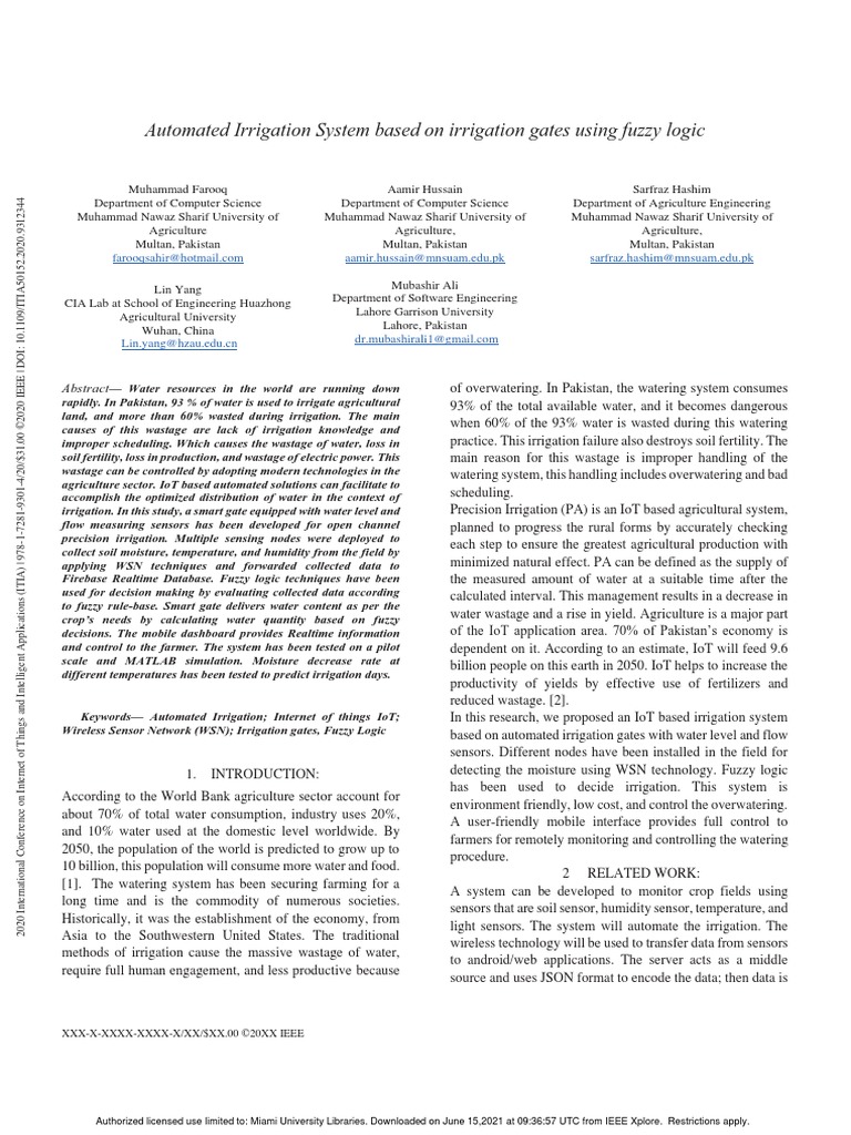 overcome water wastage, labor cost in irrigation, and power ‘Smart Irrigation Using Fuzzy Logic Method’, Journal of