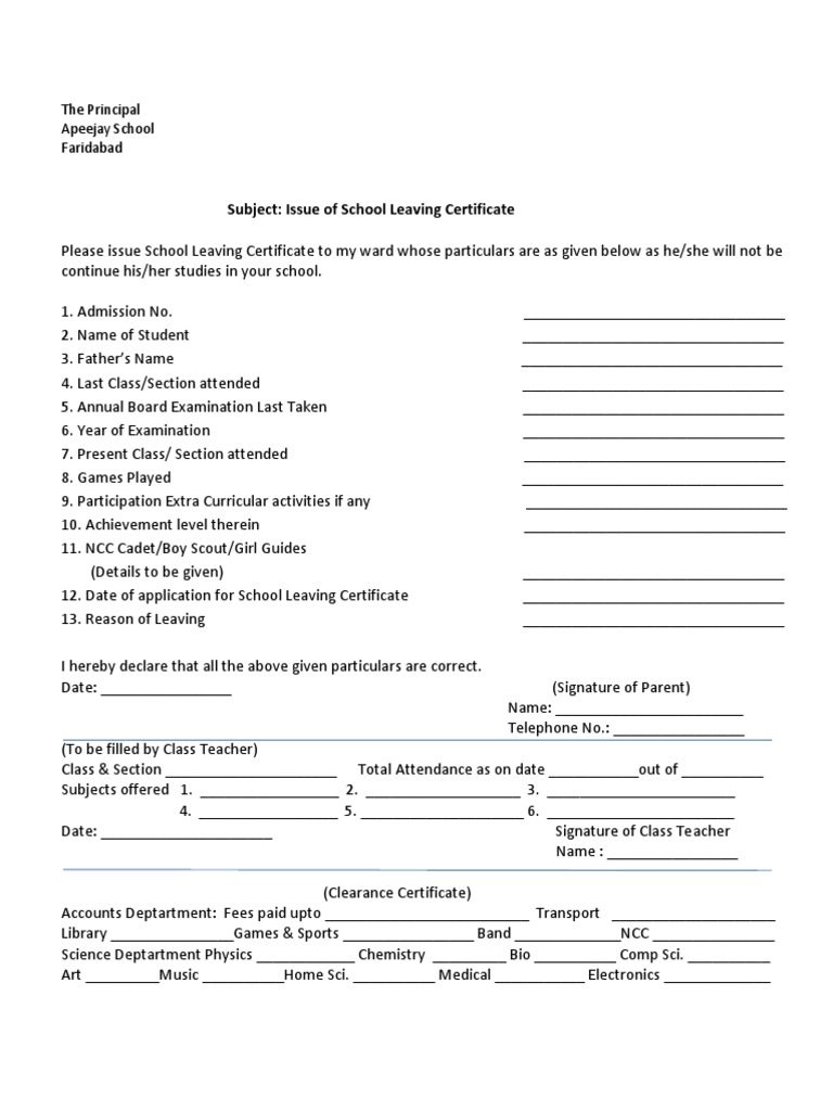 Please issue School Leaving Certificate to my ward whose particulars are as given below as he/she will not be
