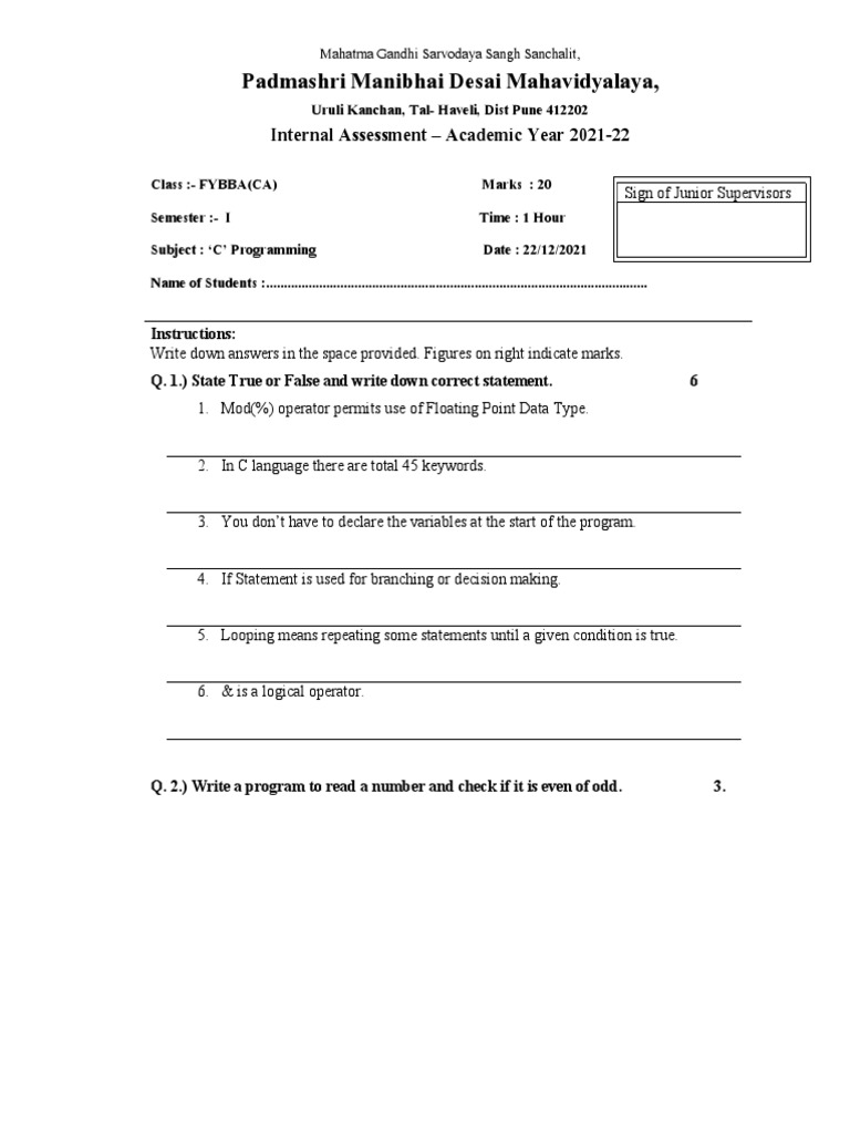 Class :- FYBBA(CA) Marks : 20 Sign of Junior Supervisors