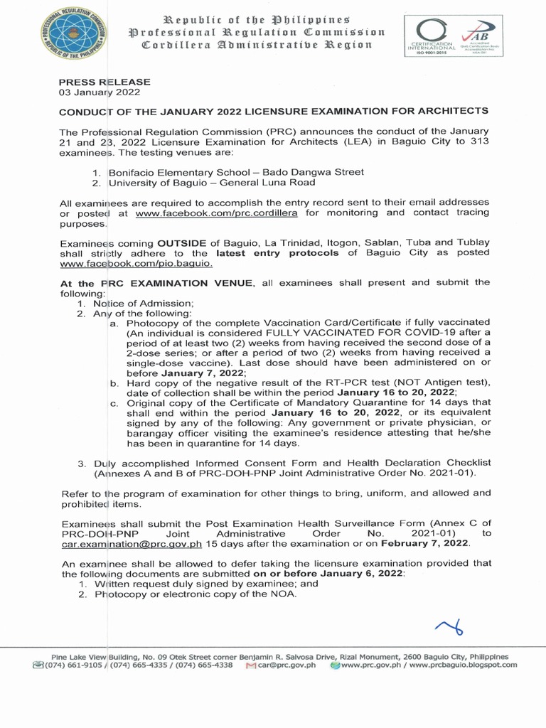 Pursuant to the PRC-DOH-PNP Administrative Order No. 01 dated July 28, 2021, examinees for the licensure examinations are