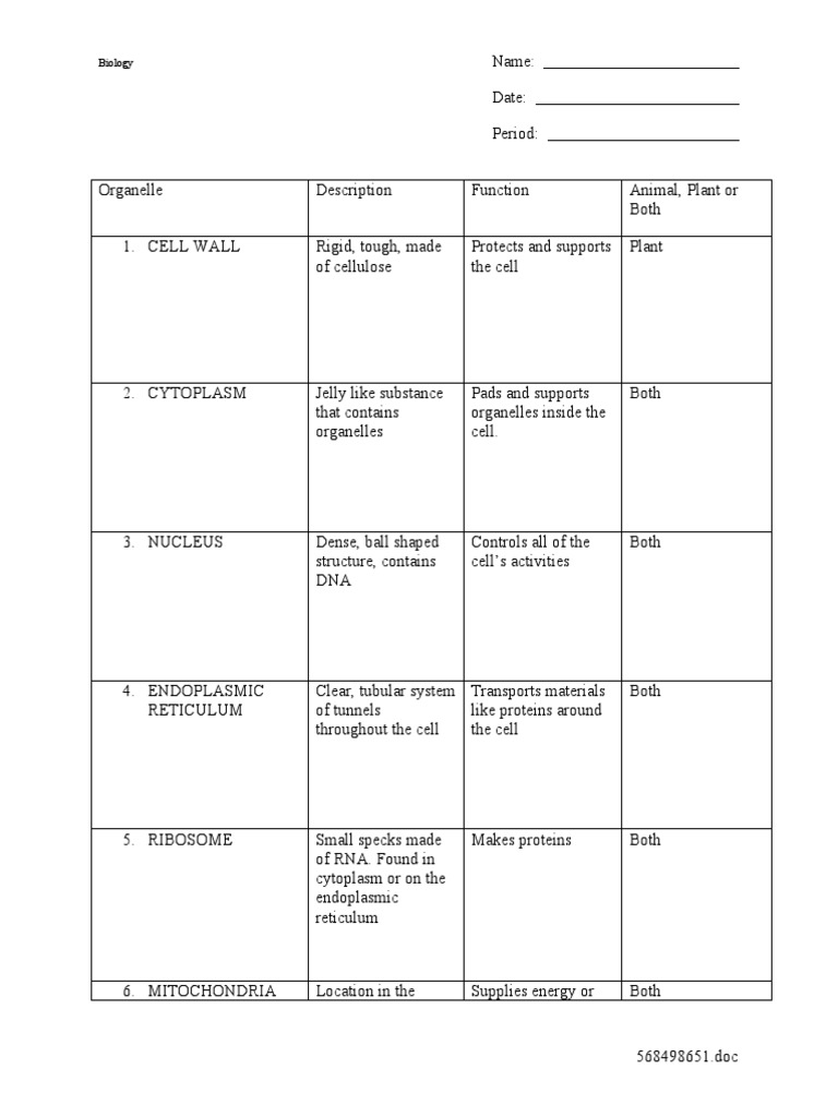 Complete the following table by writing the name of the cell part or organelle in the right hand