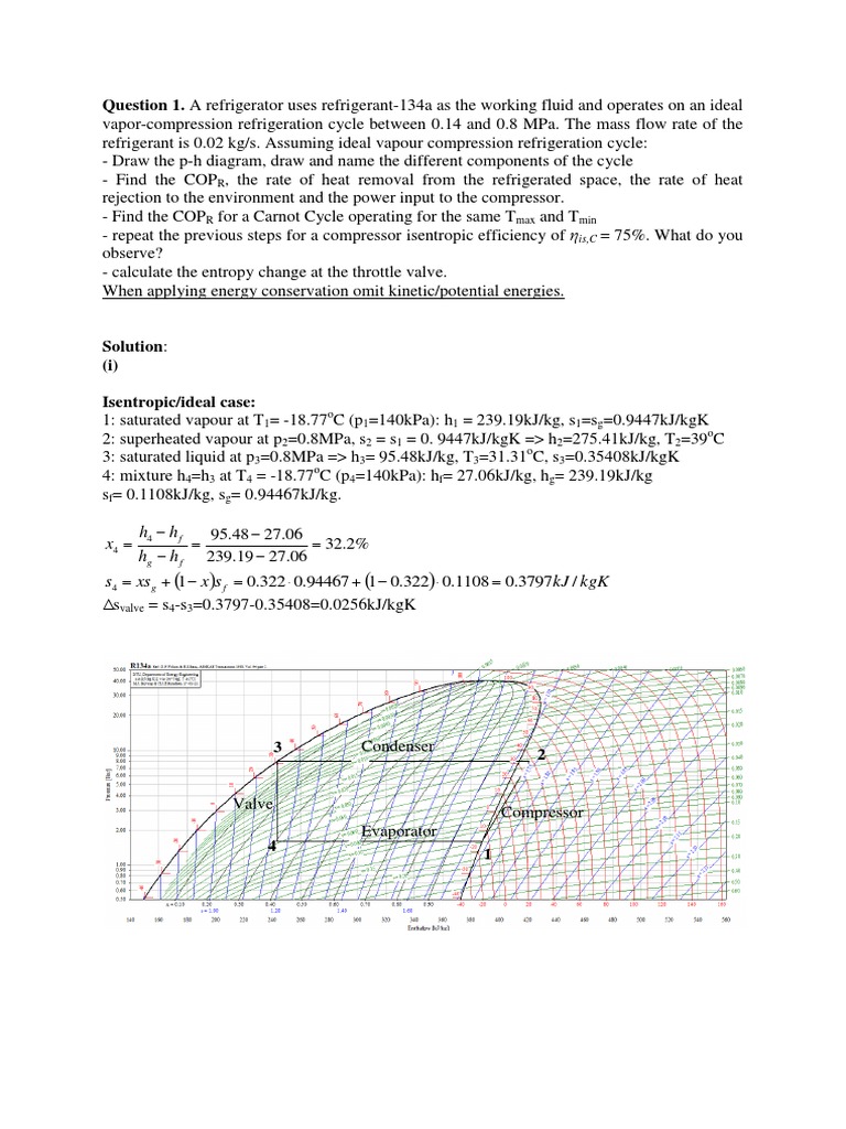 vapor-compression refrigeration cycle between 0.14 and 0.8 MPa. The mass flow rate of the