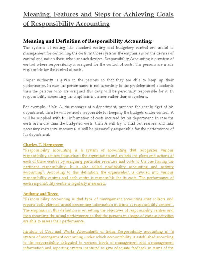 Institute of Cost and Works Accountants of India. Responsibility accounting is “a