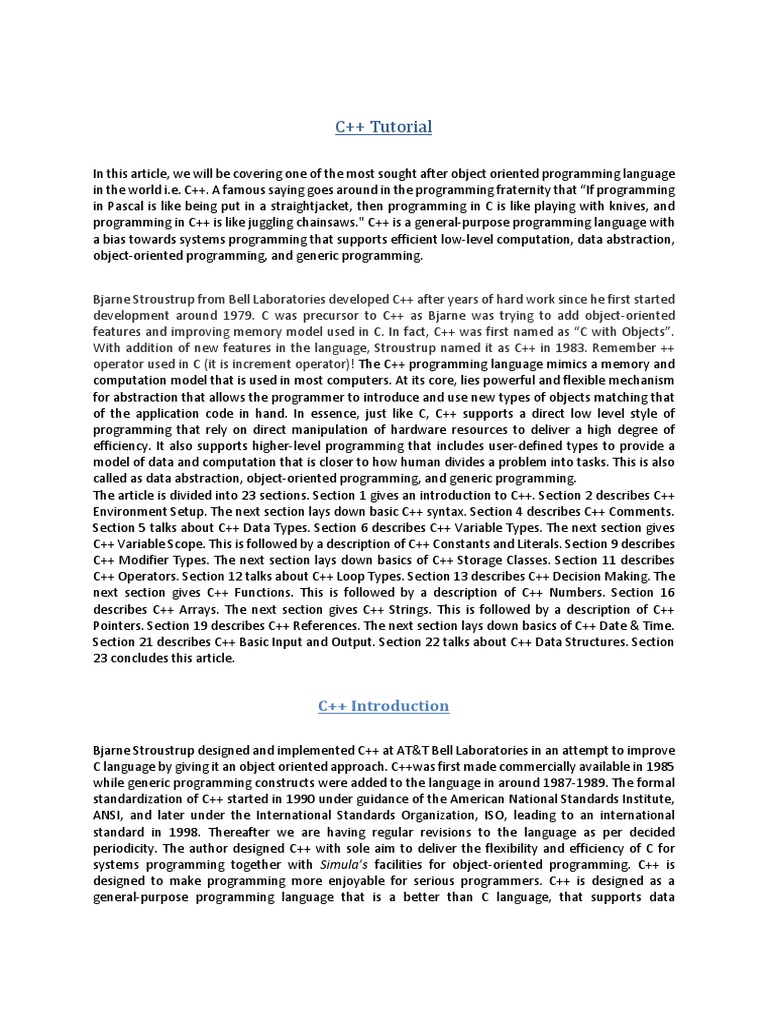 The article is divided into 23 sections. Section 1 gives an introduction to C++. Section 2 describes C++