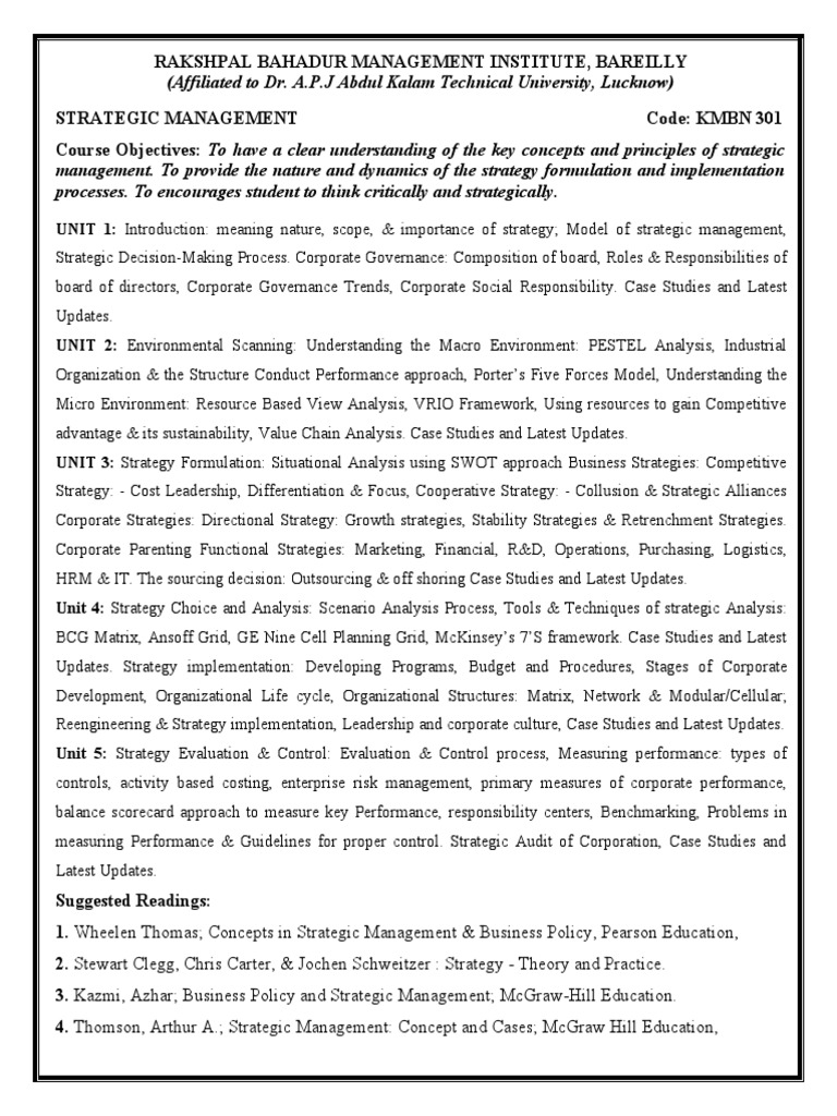 Course Objectives: To have a clear understanding of the key concepts and principles of strategic