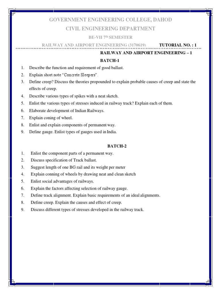 RAILWAY AND AIRPORT ENGINEERING (3170619) TUTORIAL NO. : 1