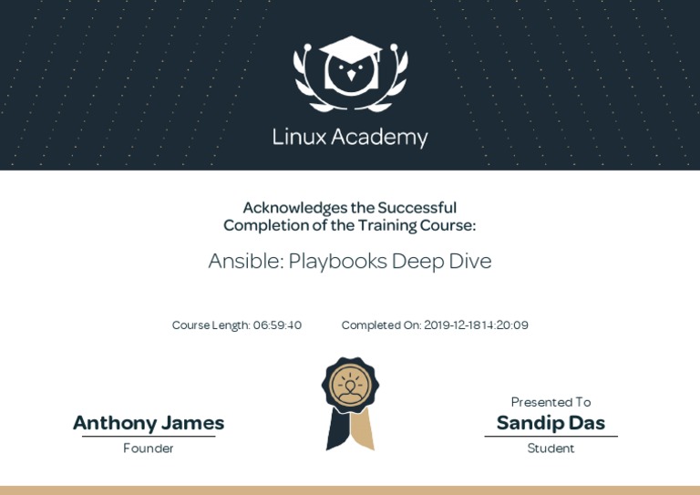 The document acknowledges the successful completion of the training course 'Ansible: Playbooks Deep Dive' by Sandip Das. The course lasted 6 hours, 59 minutes, and 40 seconds and was completed on December 18, 2019. It is presented to Anthony James, the founder.