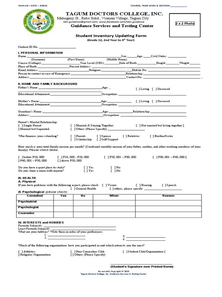 Course (College): Year Level (SHS): Date of Birth: Height: Weight: