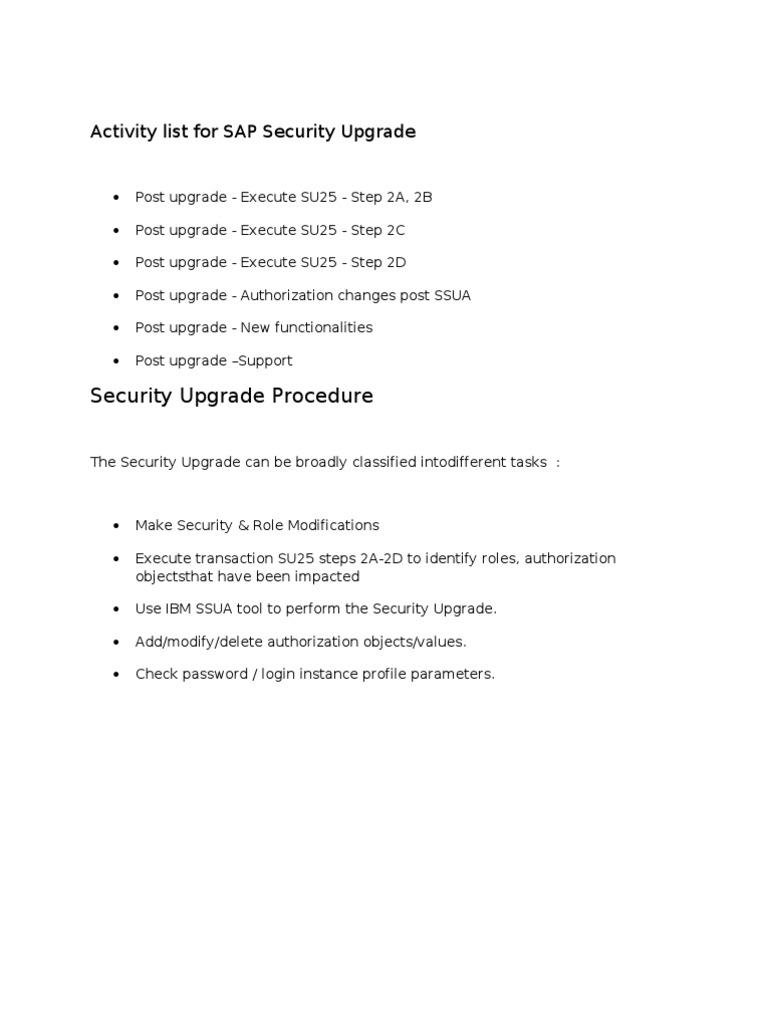 Activity list for SAP Security Upgrade