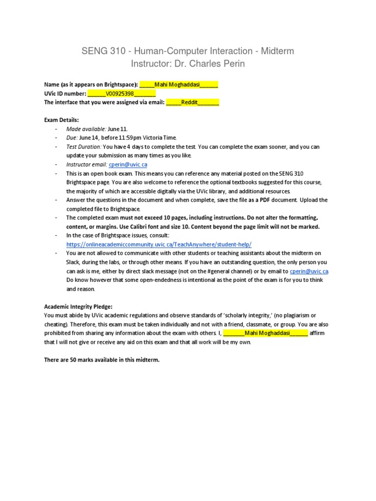 - This is an open book exam. This means you can reference any material posted on the SENG 310