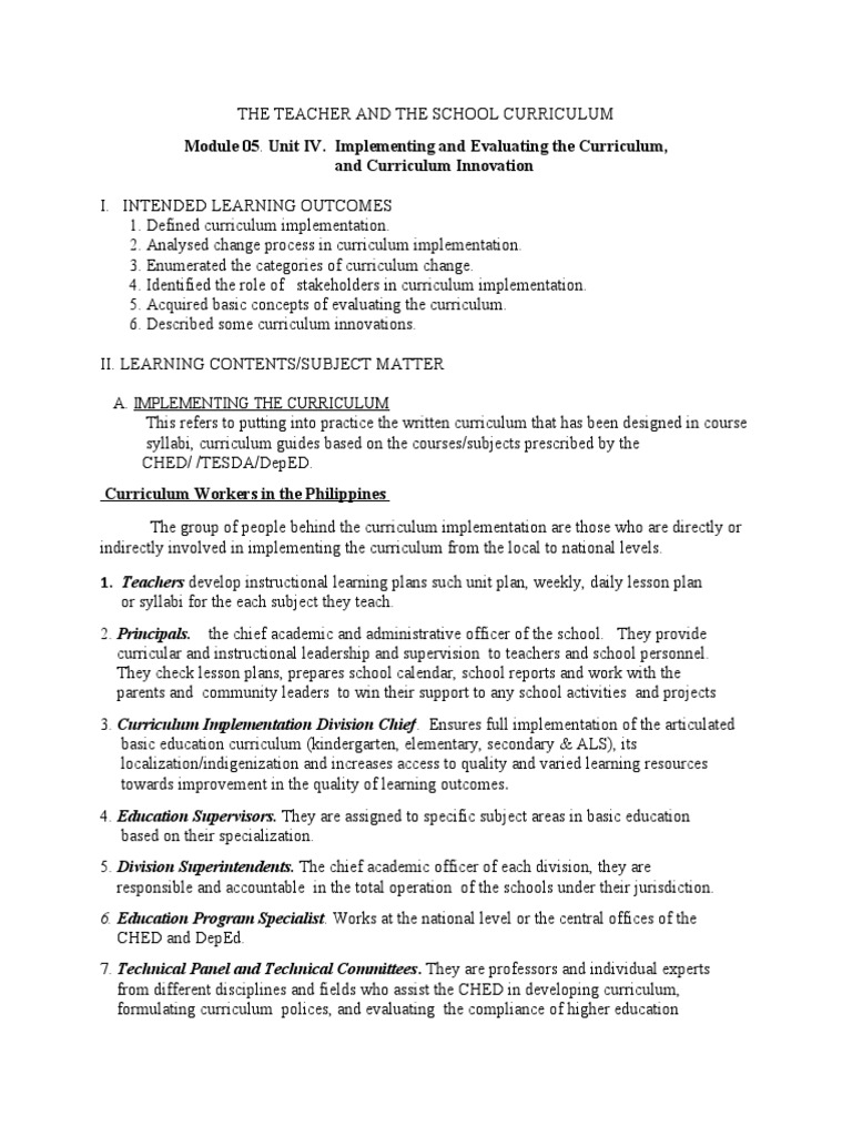 Module 05. Unit IV. Implementing and Evaluating the Curriculum,