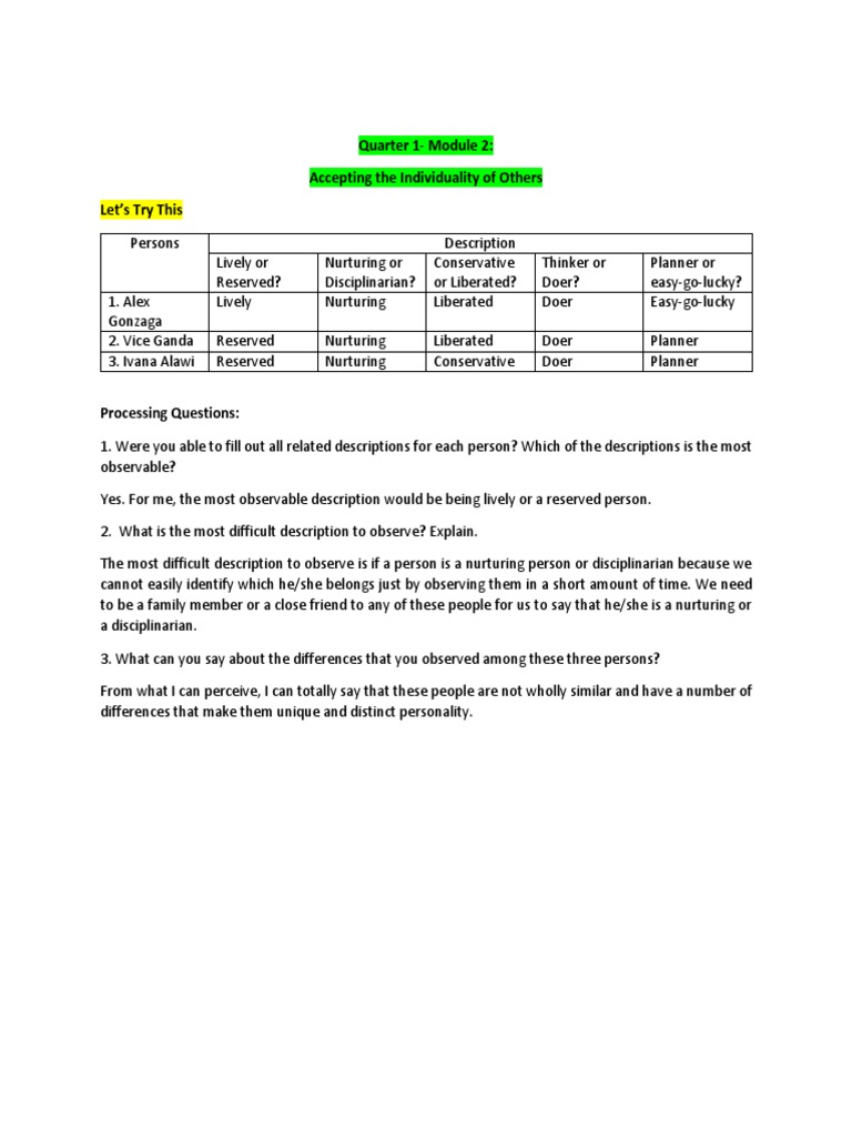 1. Were you able to fill out all related descriptions for each person? Which of the descriptions is the most