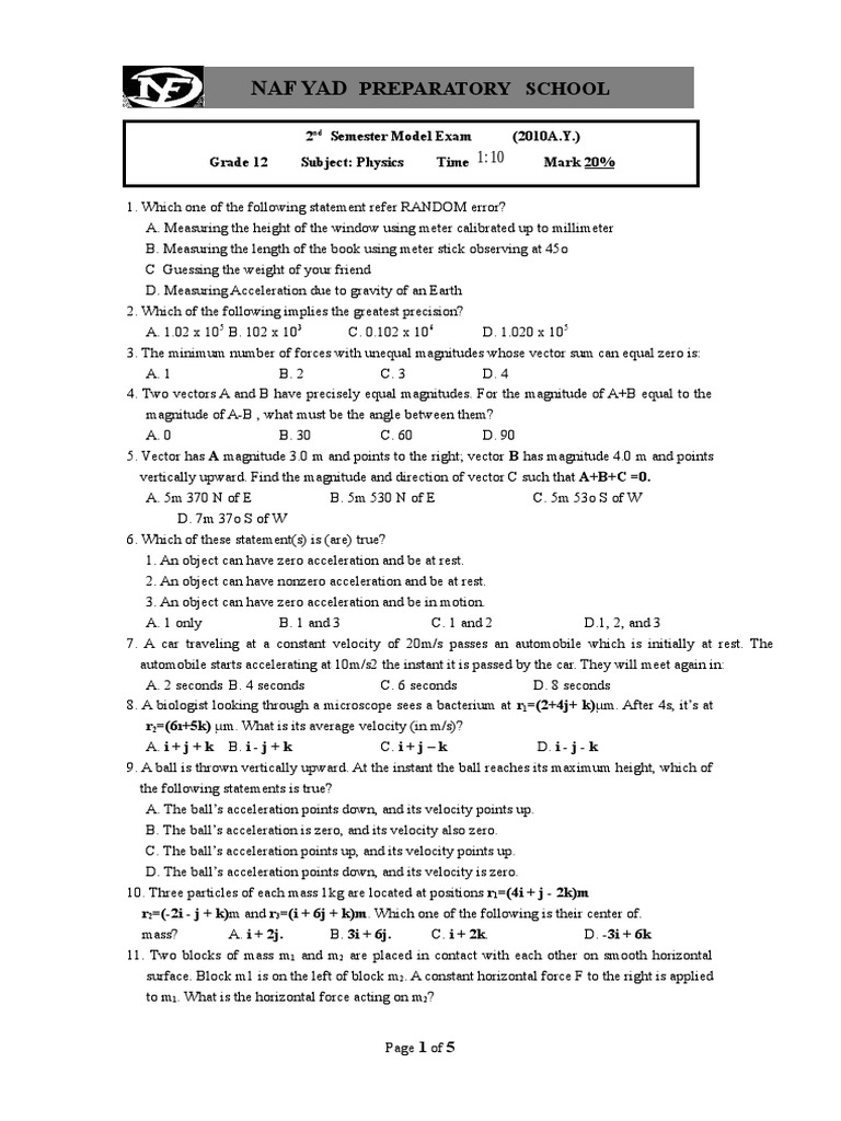 Grade 12 Subject: Physics Time 1:10 Mark 20%