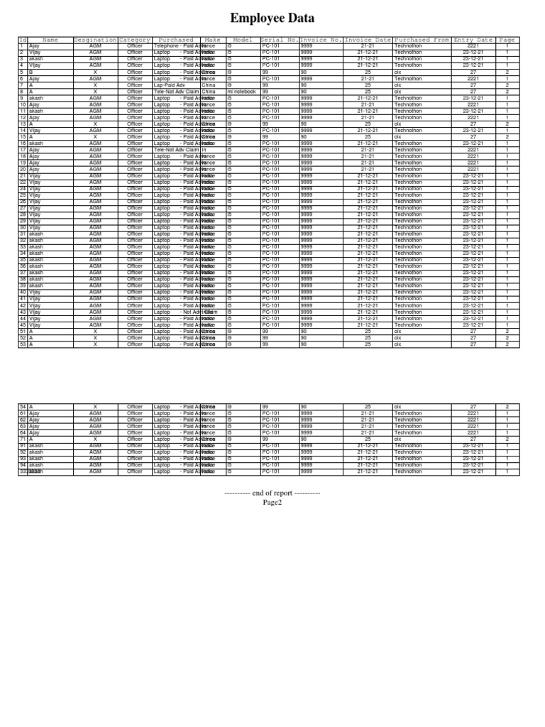 Id Name Desgination Category Purchased Make Model Serial No.Invoice No. Invoice Date Purchased From Entry Date Page