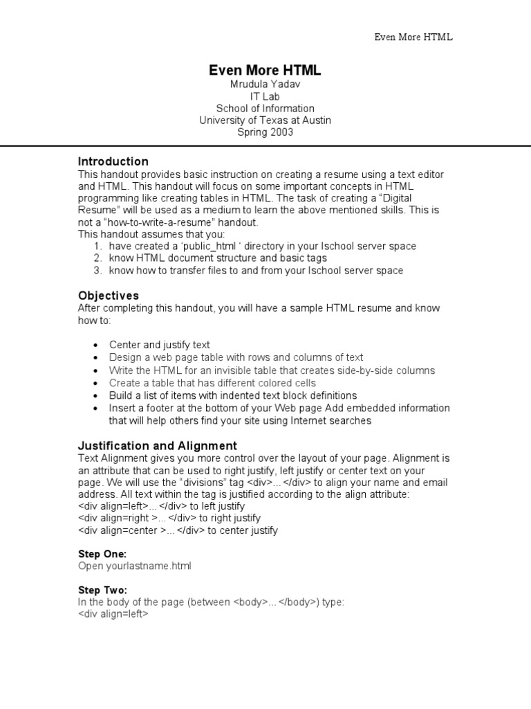 After completing this handout, you will have a sample HTML resume and know