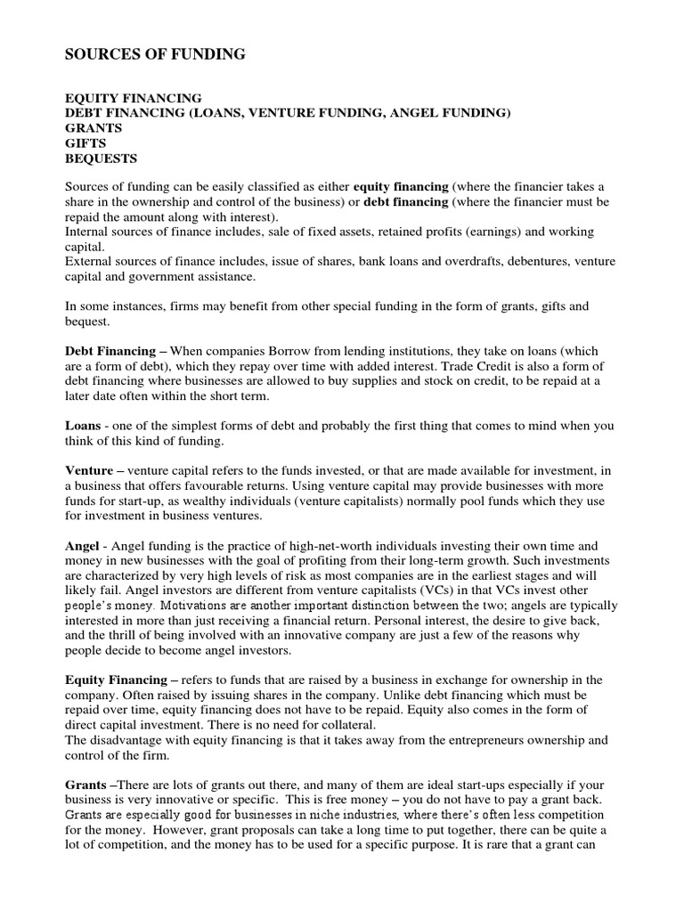 Sources of funding can be easily classified as either equity financing (where the financier takes a
