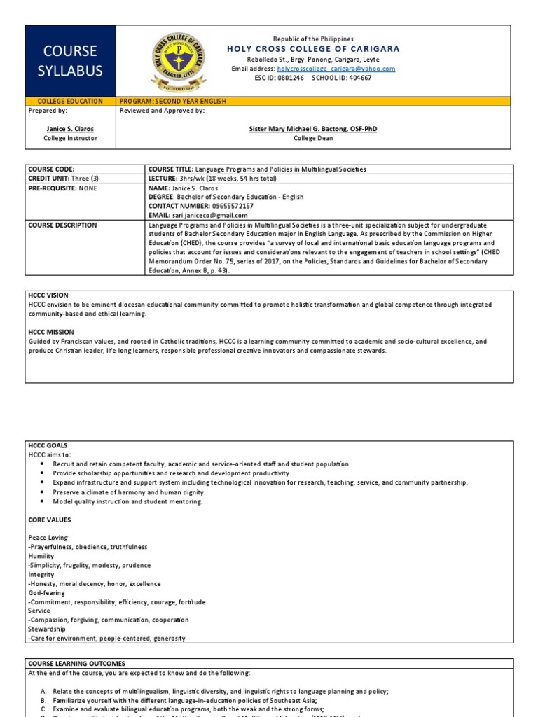 SYLLABUS Email address: holycrosscollege_carigara@yahoo.com