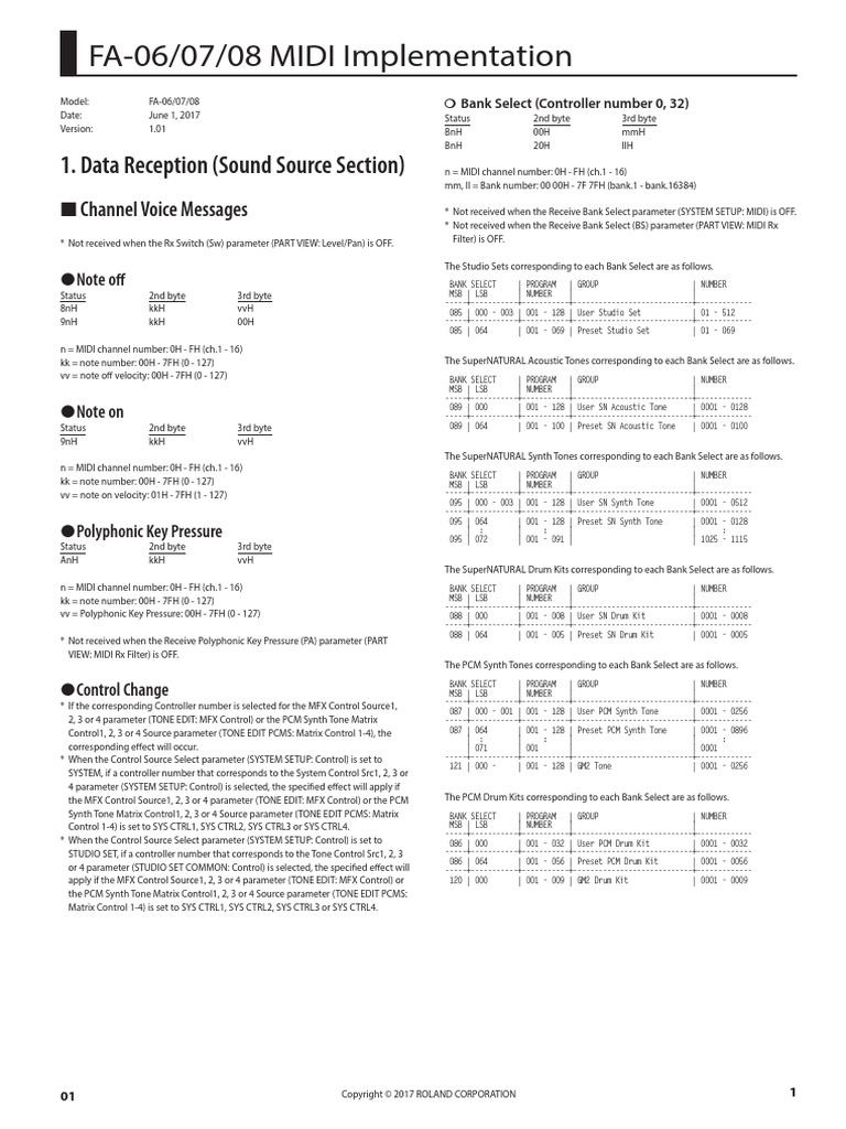 1. Data Reception (Sound Source Section) n = MIDI channel number: 0H - FH (ch.1 - 16)