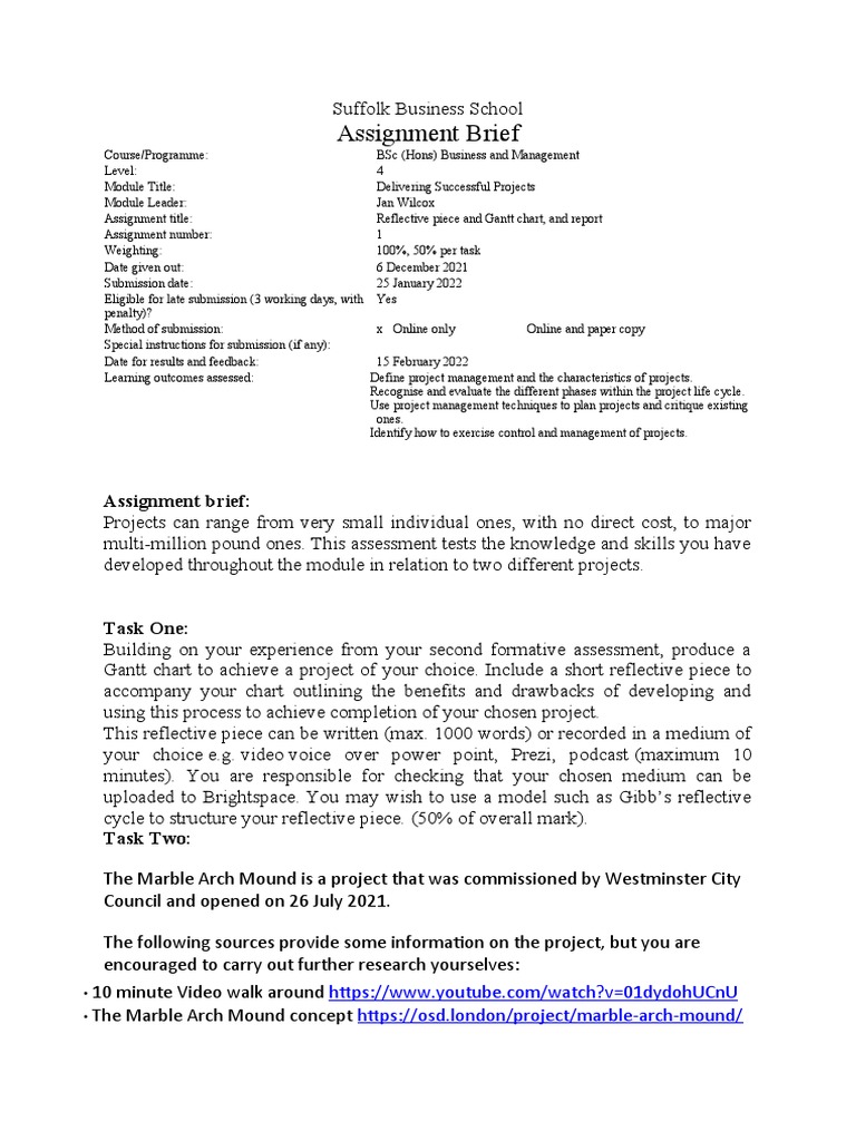 Gantt chart to achieve a project of your choice. Include a short reflective piece to