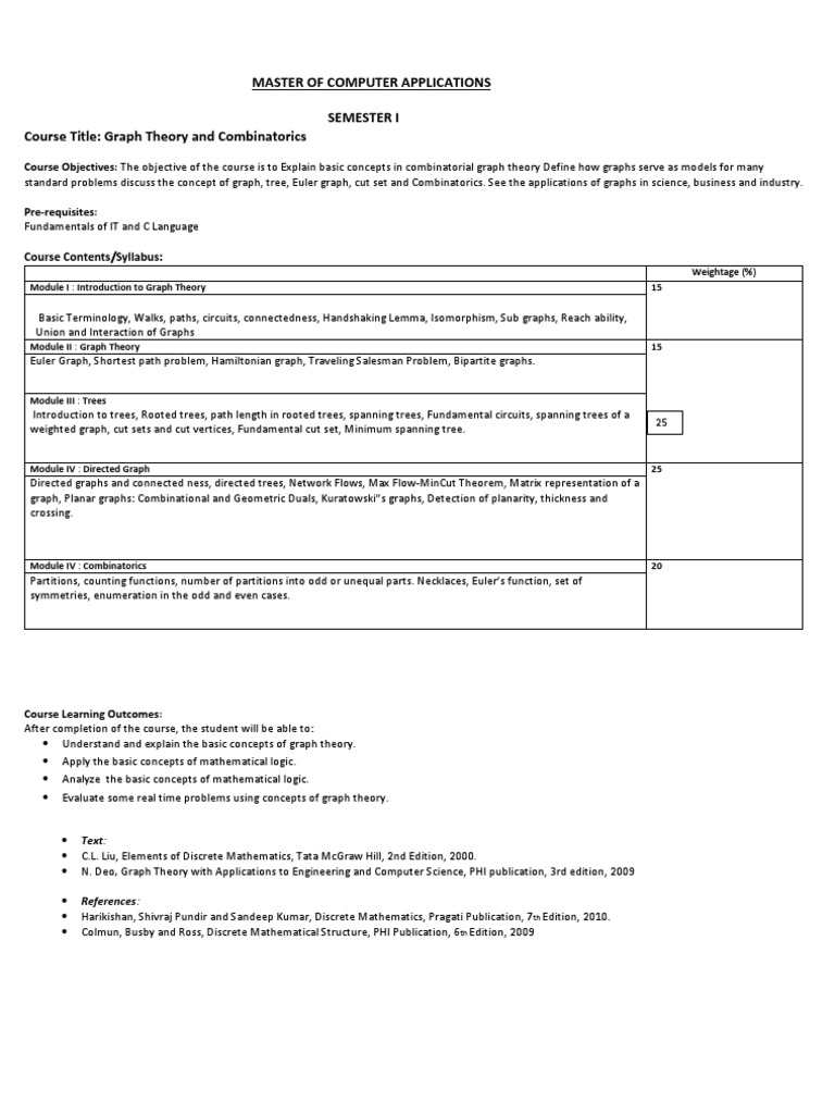 Course Objectives: The objective of the course is to Explain basic concepts in combinatorial graph theory Define how graphs serve as models for many