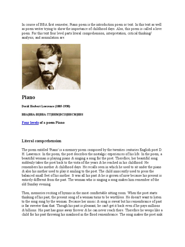 In course of BBA first semester, Piano poem is the introduction poem or text.