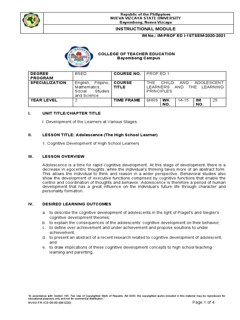 IM No.: IM-PROF ED I-1STSEM-2020-2021