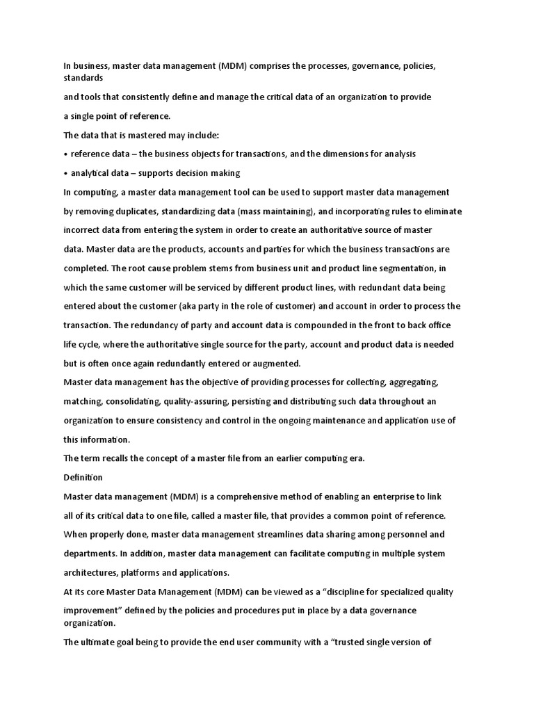 In business, master data management (MDM) comprises the processes, governance, policies,