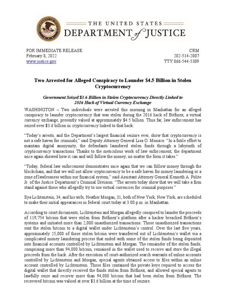 lawfully seize and recover more than 94,000 bitcoin that had been stolen from Bitfinex. The