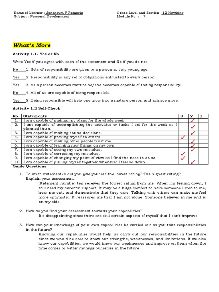 Yes 3. As a person becomes mature he/she becomes capable of taking responsibility.
