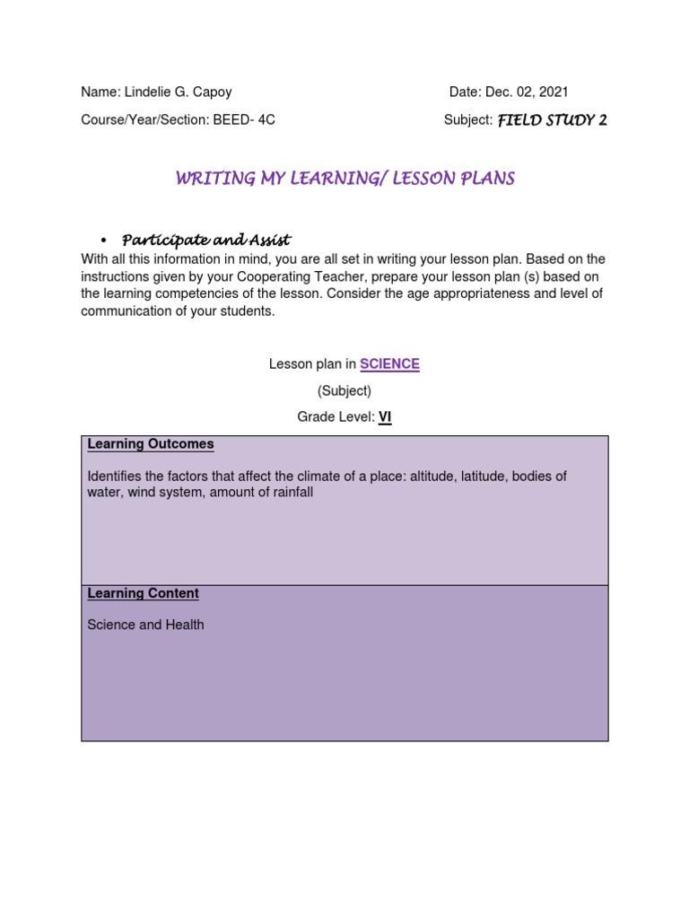 Teacher LINDELIE G. CAPOY Learning Area