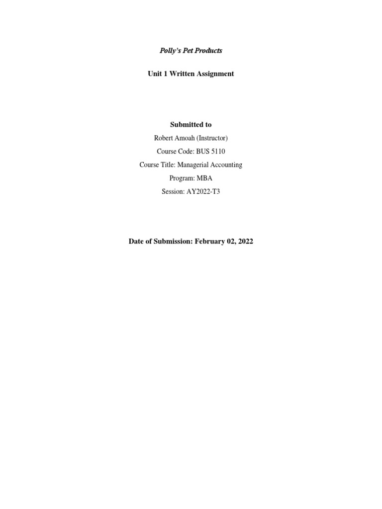specific case and calculation, so there is no references other than the excel file of (Polly's Pet Products,