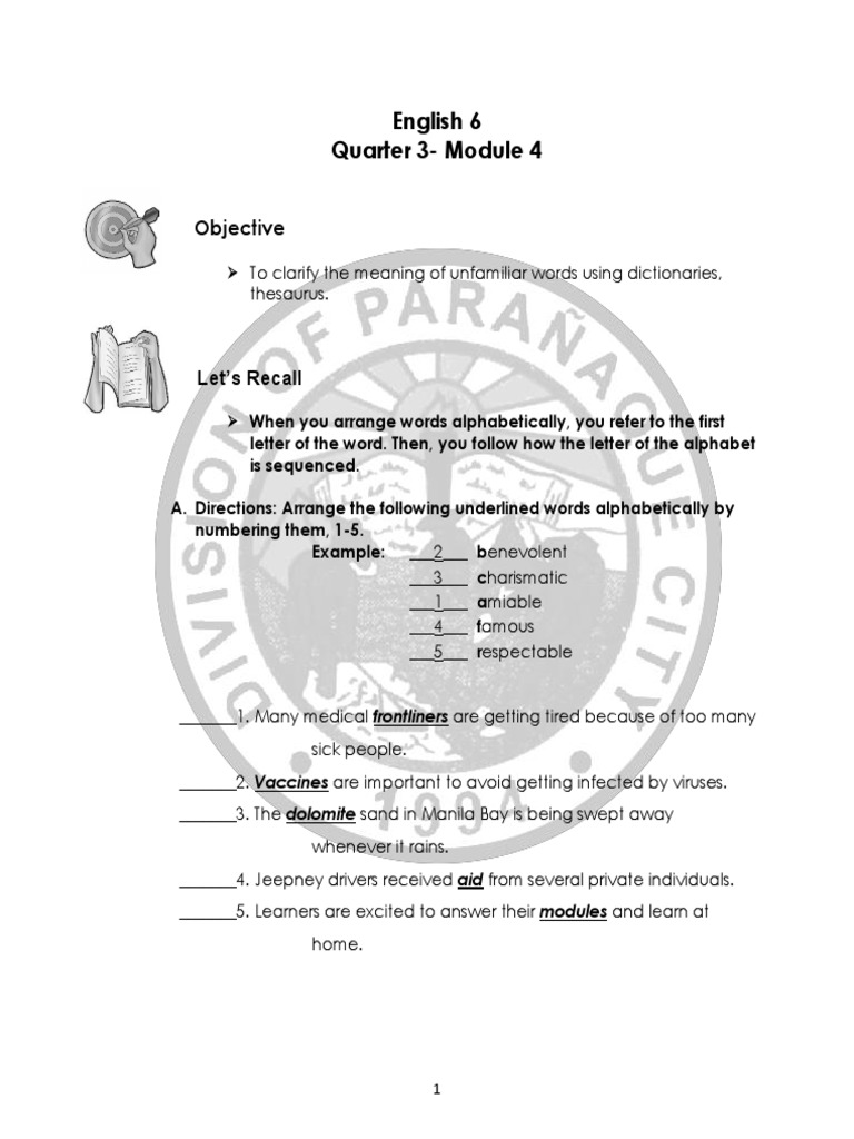 A. Directions: Arrange the following underlined words alphabetically by