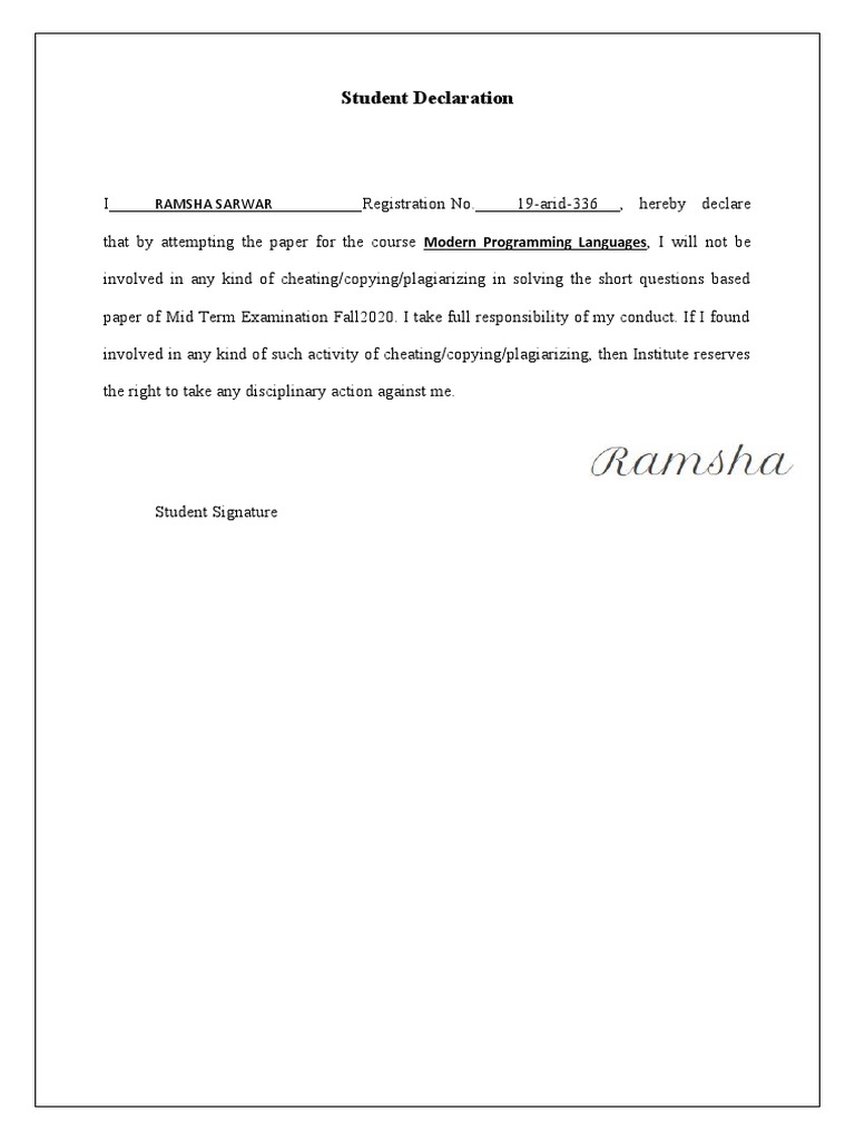 that by attempting the paper for the course Modern Programming Languages, I will not be