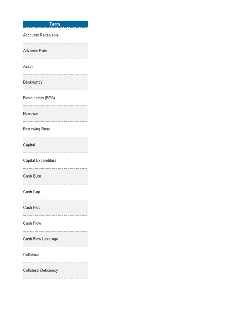 loans, letters of credit, and swingline loans. A facility is essentially another name for a loan taken out by a company.