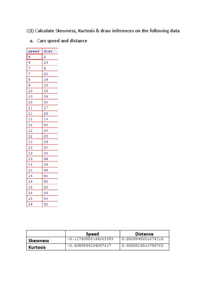 Q1) Calculate Skewness, Kurtosis & draw inferences on the following data