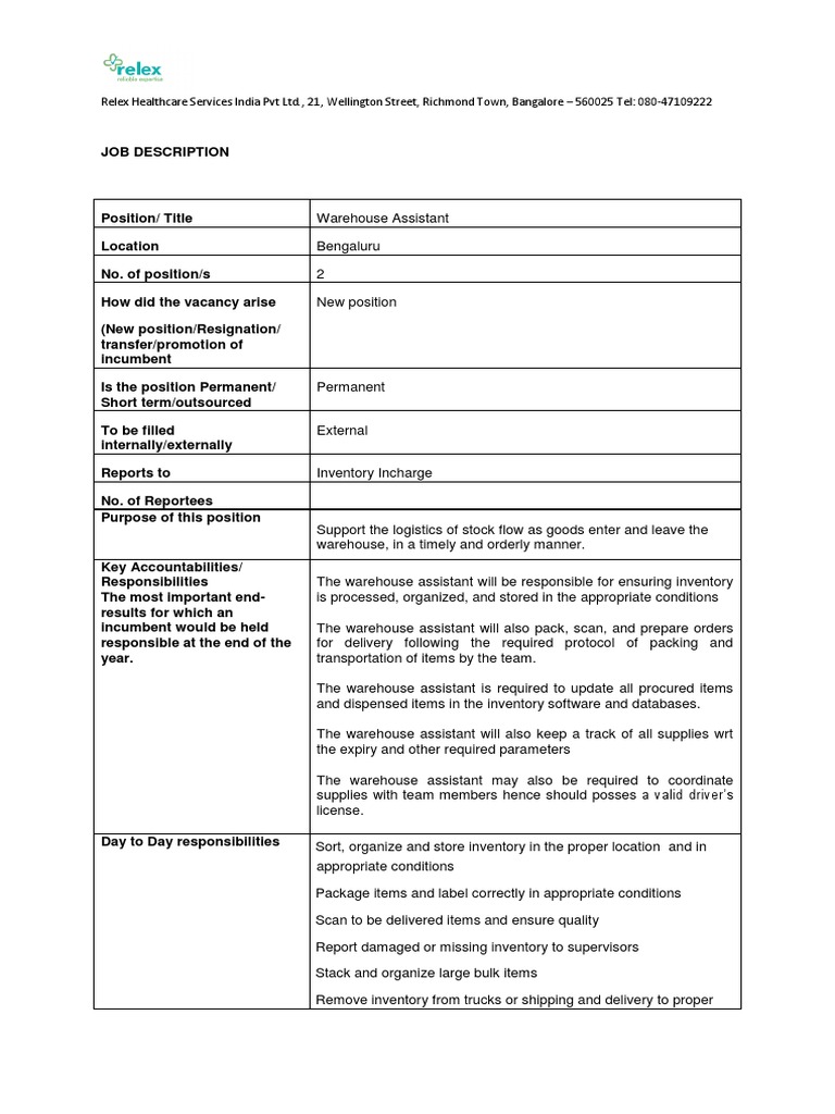 Responsibilities The warehouse assistant will be responsible for ensuring inventory