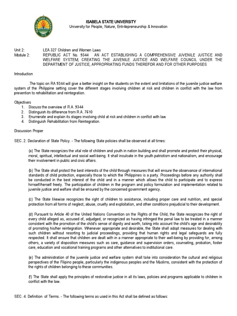 Module 2: REPUBLIC ACT No. 9344 AN ACT ESTABLISHING A COMPREHENSIVE JUVENILE JUSTICE AND