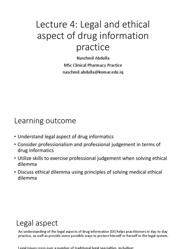 An understanding of the legal aspects of drug information (DI) helps practitioners in day-to-day